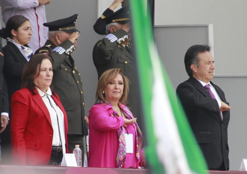 Como muestra de la buena relación y coordinación que existe entre ambas entidades y el gobierno federal, Cuéllar Cisneros asistió al evento en que pudo observar la participación de carros alegóricos, diferentes contingentes militares y educativos.