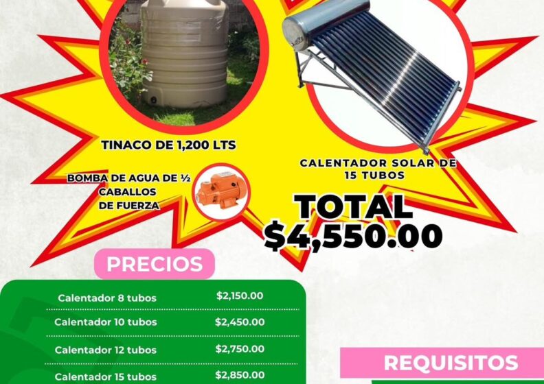 El Ayuntamiento de San Pablo del Monte (SPM), a través de la Dirección de Bienestar Social; y la Coordinación de Desarrollo Rural y Productivo, pone al alcance de la población el Paquete Bienestar, que incluye un tinaco para 1,200 litros de agua, bomba de medio caballo de fuerza y calentador solar de 15 tubos, todo a un precio especial.