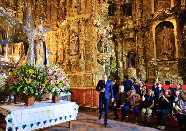 La titular del Ejecutivo local y el cantautor saludaron y se tomaron fotografías con las y los fieles católicos, que con ansias esperaban la salida de la Virgen de la Basílica de Ocotlán para acompañarla en su recorrido por las principales calles de la ciudad capital.