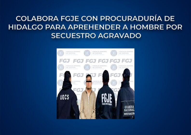 La Fiscalía General de Justicia del Estado (FGJE) colaboró con la Procuraduría General de Justicia del Estado de Hidalgo (PGJEH) para aprehender a Juan Carlos N., por su presunta responsabilidad en el delito de secuestro agravado.