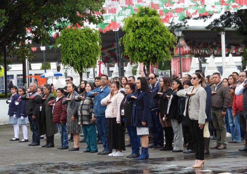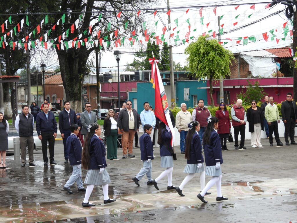 El acto cívico contó con la participación de la escuela Primaria Mártires de 1810 de la comunidad de San José Tetel, además de la presencia de integrantes del Cuerpo Edilicio y personal administrativo.