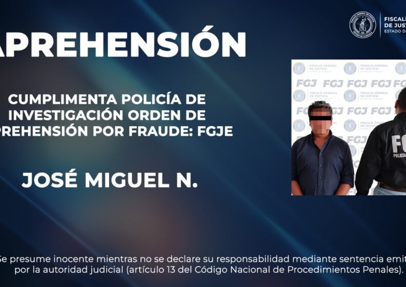 Por su presunta responsabilidad en el delito de fraude, elementos de la Policía de Investigación de la Fiscalía General de Justicia del Estado (FGJE) cumplimentaron una orden de aprehensión en contra de José Miguel N.