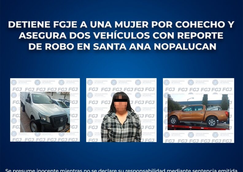 La Fiscalía General de Justicia del Estado (FGJE), a través de la Policía de Investigación, realizó la detención en flagrancia de Brenda N. por el delito de cohecho y aseguró dos vehículos que contaban con reporte de robo en el municipio de Santa Ana Nopalucan.