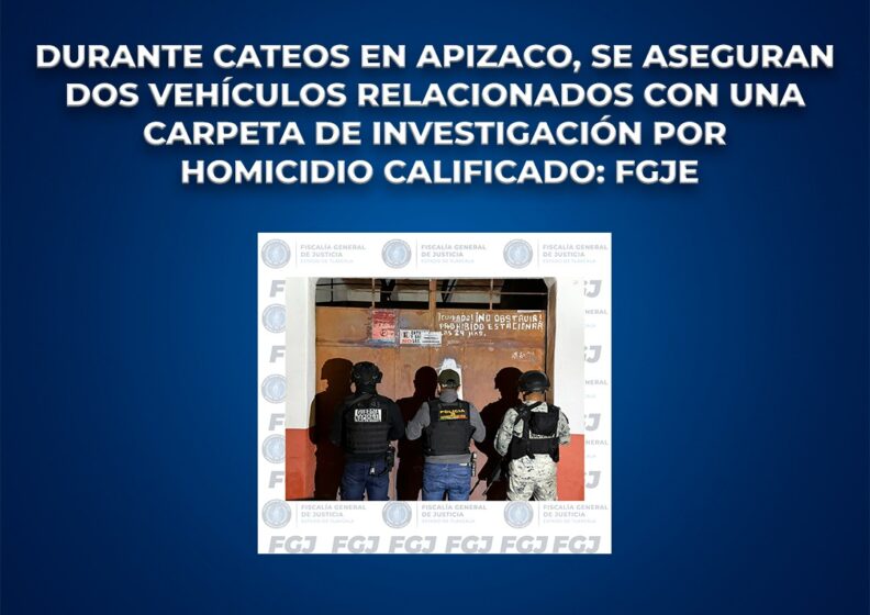 La Fiscalía General de Justicia del Estado (FGJE), a través de la Policía de Investigación, ejecutó de manera simultánea dos órdenes de cateo en el municipio de Apizaco, donde aseguró dos vehículos relacionados con una carpeta de investigación por el delito de homicidio calificado.