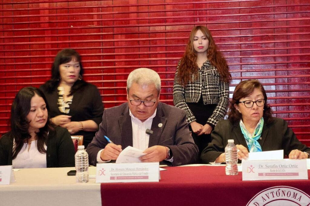 El acuerdo fue signado en el auditorio anexo a Rectoría de la UATx, por el titular de la SEPE, Homero Meneses Hernández y en representación del rector Serafín Ortiz Ortiz, la secretaria de Investigación y Posgrado, Margarita Martínez Gómez; y permitirá a 50 estudiantes de la licenciatura en Educación Especial de la Facultad de Ciencias para el Desarrollo Humano, integrarse al programa.