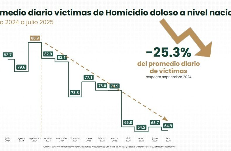 La funcionaria explicó que dicha reducción se debe a que el promedio diario de víctimas de homicidio doloso en septiembre de 2024 fue de 86.9, mientras que, en julio de 2025, de 64.9. Además, resaltó que julio de este año es el mes con el menor número de homicidios registrados en comparación con julio de 2015, todo lo cual atribuyó a la implementación de la Estrategia Nacional de Seguridad.