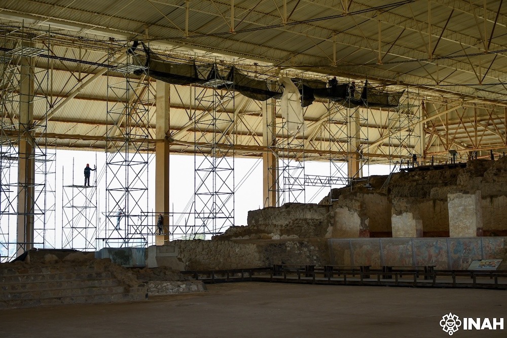 Luego de cuatro meses de labores, la Secretaría de Cultura del Gobierno de México, a través del Instituto Nacional de Antropología e Historia (INAH) y del Centro INAH Tlaxcala, concluyó los trabajos de mantenimiento general de la cubierta del Gran Basamento de la Zona Arqueológica de Cacaxtla, la cual desde 2022 solo recibía labores correctivas puntuales.