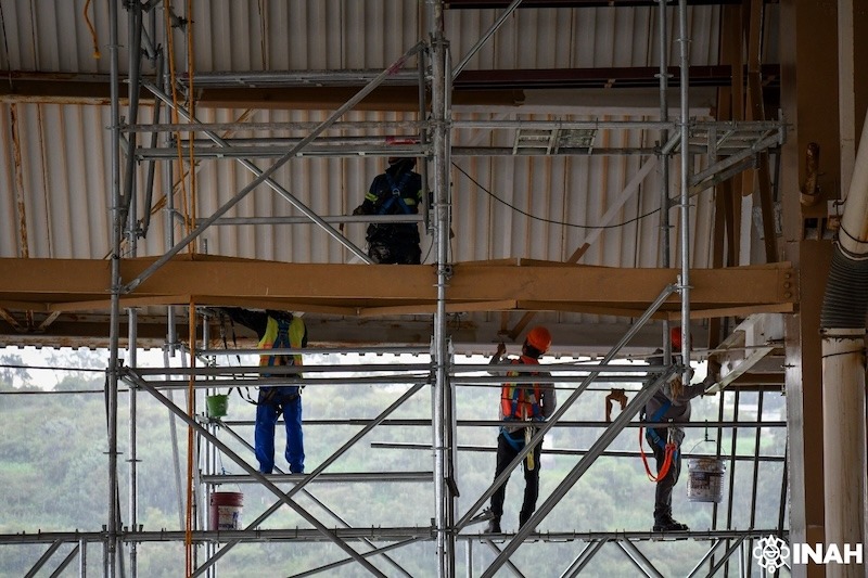 Las tareas, supervisadas por las secciones de Arqueología, Restauración y Monumentos Históricos del Centro INAH, se enfocaron en la sustitución de canalones de desagüe y mantenimiento de algunas láminas de acero galvanizado en mal estado, así como de las conexiones de bajantes de agua pluvial, limpieza y pintura de la estructura de acero.