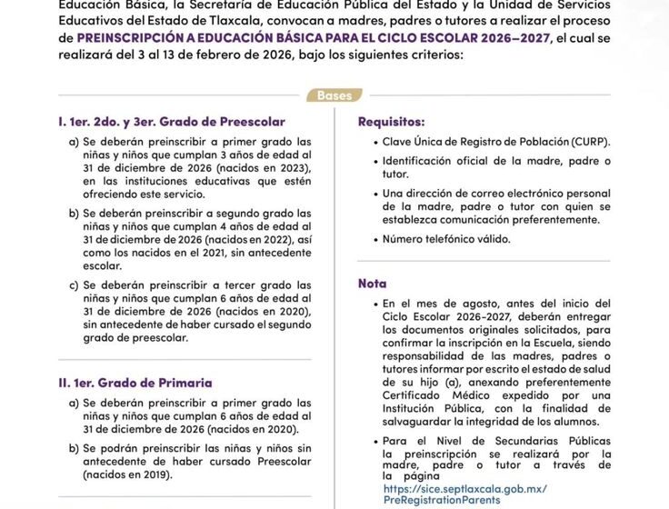El trámite deberá realizarse a través de la plataforma oficial https://sice.septlaxcala.gob.mx/PreRegistrationParents a partir del 3 y hasta el 13 de febrero.