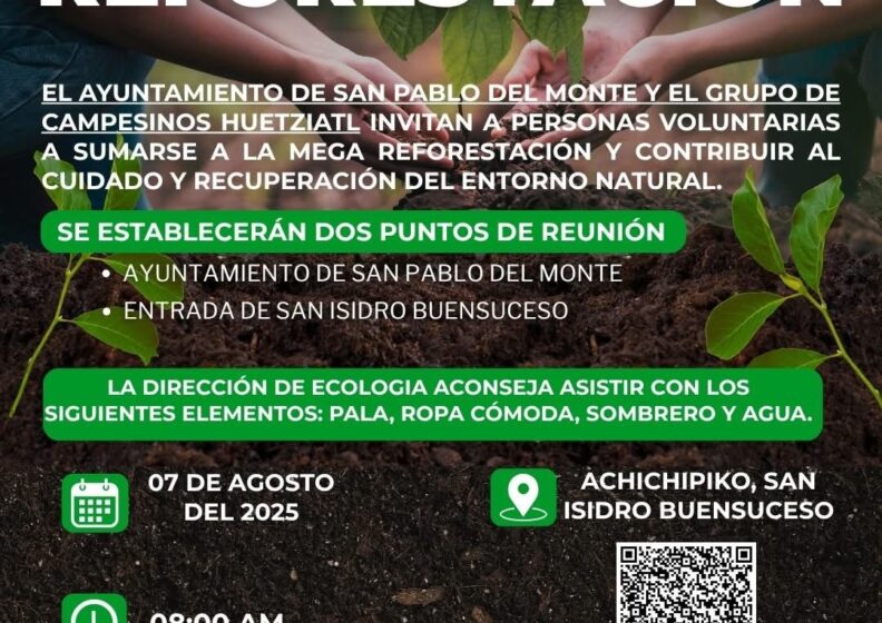 El Ayuntamiento de San Pablo del Monte, a través de la Coordinación de Ecología y el valioso apoyo del grupo de campesinos Huetziatl, invitan a personas voluntarias a sumarse a la Mega Reforestación este 7 de agosto en la zona conocida como Achichipiko, en las faldas de La Malinche.