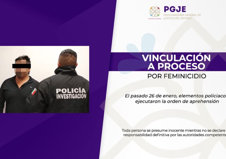 Derivado del trabajo realizado por el agente del Ministerio Público del fuero común de la Procuraduría General de Justicia del Estado (PGJE), un Juez de Control determinó vincular a proceso a un masculino por el delito de feminicidio.