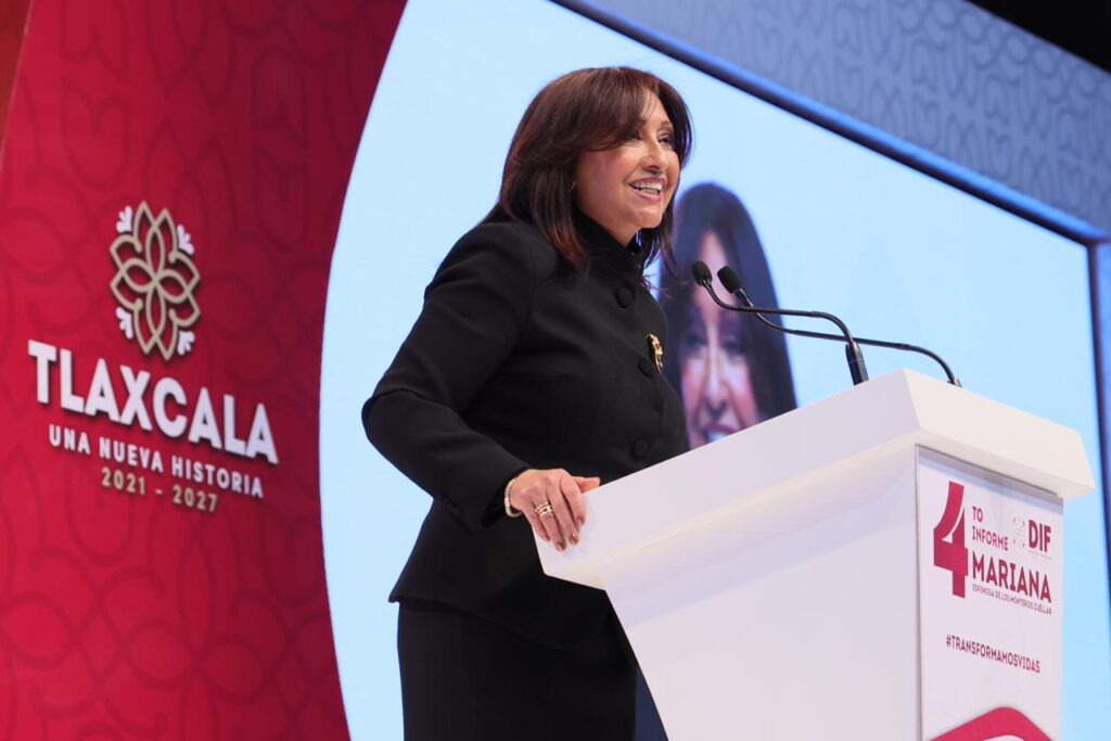Durante su intervención, la gobernadora Lorena Cuéllar Cisneros reconoció la labor de la presidenta honorífica del SEDIF, Mariana Espinosa de los Monteros Cuéllar, al destacar su entrega y compromiso con las familias tlaxcaltecas.