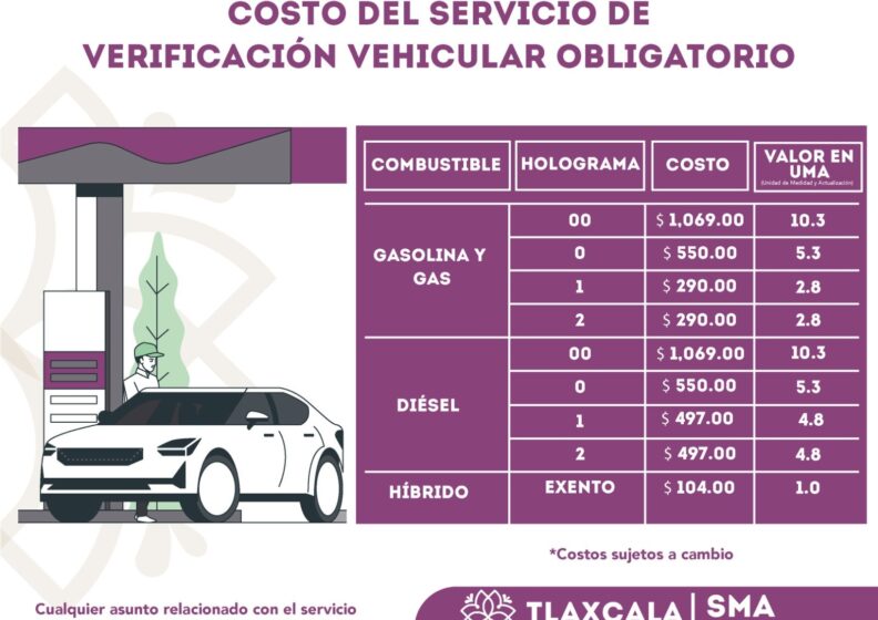 La Secretaría de Medio Ambiente (SMA) de Tlaxcala, a través de la Dirección de Gestión Ambiental y de acuerdo con el Instituto Nacional de Estadísticas e Informática (Inegi), informa que debido al incremento del valor de la Unidad de Medida y Actualización (UMA), que a partir del 1 de febrero es de 103 pesos con 74 centavos, los servicios de verificación vehicular tendrán una actualización en sus costos, ya que son tasados con esta unidad.