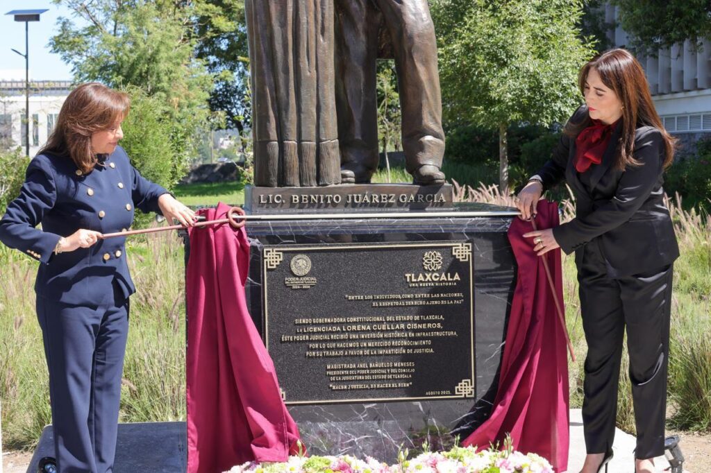 Durante el homenaje cívico realizado en las instalaciones de la Ciudad Judicial, también se realizó la develación de la escultura y placa de Benito Juárez García, reconocido en la historia de México como uno de los grandes abogados y ministro de la Suprema Corte de Justicia de la Nación (SCJN), acto en reconocimiento y honor al respaldo que ha brindado la mandataria estatal para la transformación y la evolución del Poder Judicial en Tlaxcala.