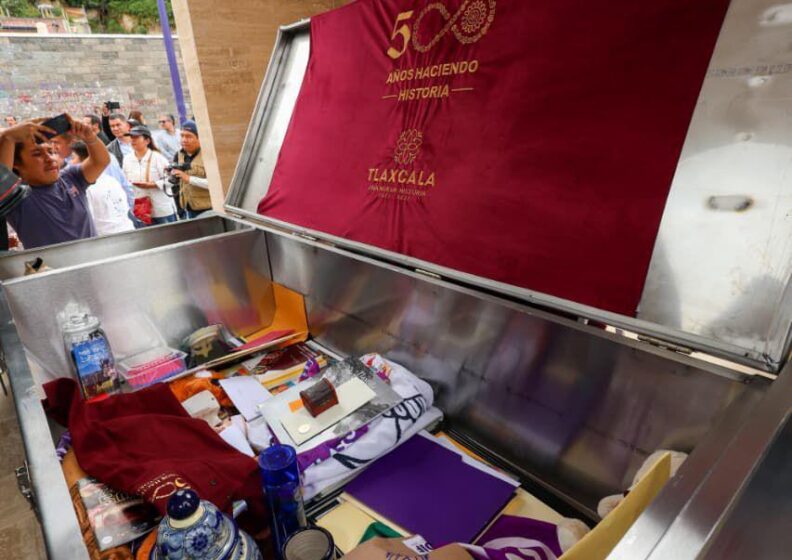 También fueron depositados periódicos, fotografías, el programa oficial de actividades por los 500 años, recuerdos conmemorativos de los festejos y objetos emblemáticos de la vida cotidiana y cultural de Tlaxcala, como un traje y una máscara de carnaval, un bastón de mando de Tizatlán y una memoria USB con poesía y crónicas. Estos elementos, señaló Vázquez Velázquez, permitirán que las generaciones del futuro reconozcan la riqueza cultural, social y espiritual que define a Tlaxcala en este momento histórico.